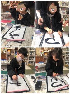 1年生は筆を持つのは初めてだったので、スタッフに少し手を添えてもらって書きました。なかなか味のある字になりました😊
