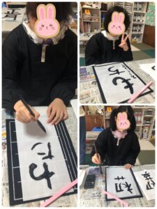 他の子は、自分で書きたい言葉を考えてから書きました。「もち」「つり」「初夢」などです。推しのアイドルの名前を書いた子もいました😁